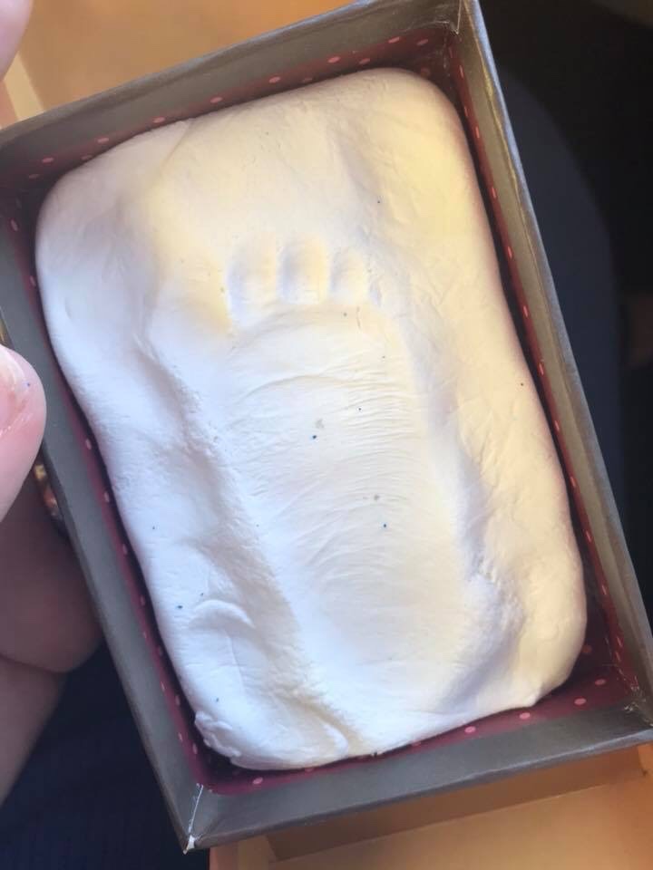 I don’t think I went back into the hospital. I think we rode over to the parking deck where Andy’s car was parked and waited for my mama there. When she walked up, she was holding a little box. Inside were Ruby’s things that had been collected from the NICU nurses. I’ve since added to our mementoes, but they’d given us her I.d. Bracelet, a dress they’d put her in and taken pictures after we left, a disposable camera with those pictures (I still haven’t developed those pictures), a lock of her hair, and, my favorite, her foot print in a little mold.